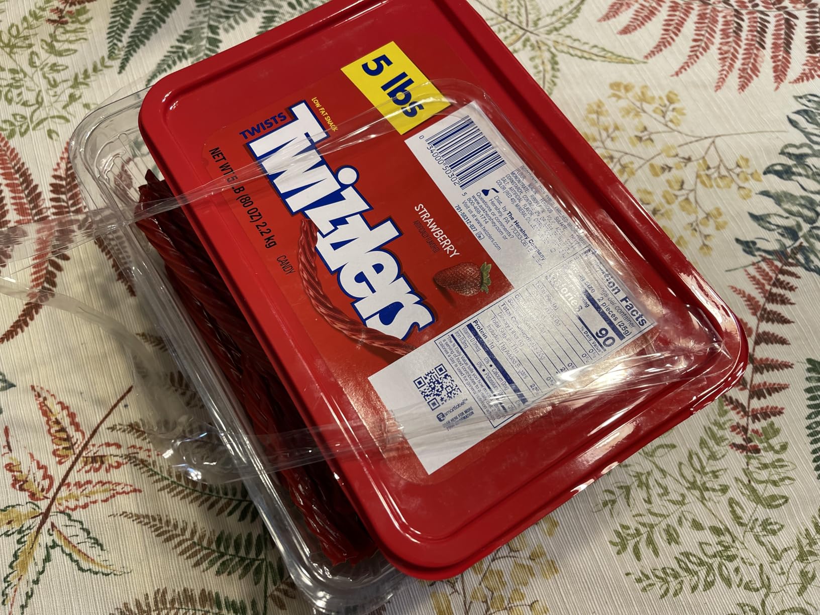 About this item Contains one (1) 5-pound bulk tub of TWIZZLERS Twists Strawberry Flavored Chewy Candy A perfect movie marathon treat and classic everyday, strawberry flavored chewy snack that provides long-lasting goodness Low fat, kosher certified, strawberry flavored candy in a bulk candy tub sealed for sweet freshness Use TWIZZLERS candy for filling birthday and retirement party dessert tables or bridal and baby shower candy dishes Chewy TWIZZLERS Twists candies with the "Twist You Can't Resist" to enjoy as Christmas, Valentine's Day, Halloween and Easter candy